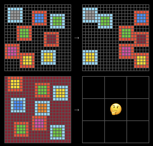 In the ARC task, we usually have several pairs of examples (input $x$ and output $y$), and a new test input $x_n$, with the goal of predicting $y_n$. If we view this process as a sequence flowing through time, then the current “historical data” is:
