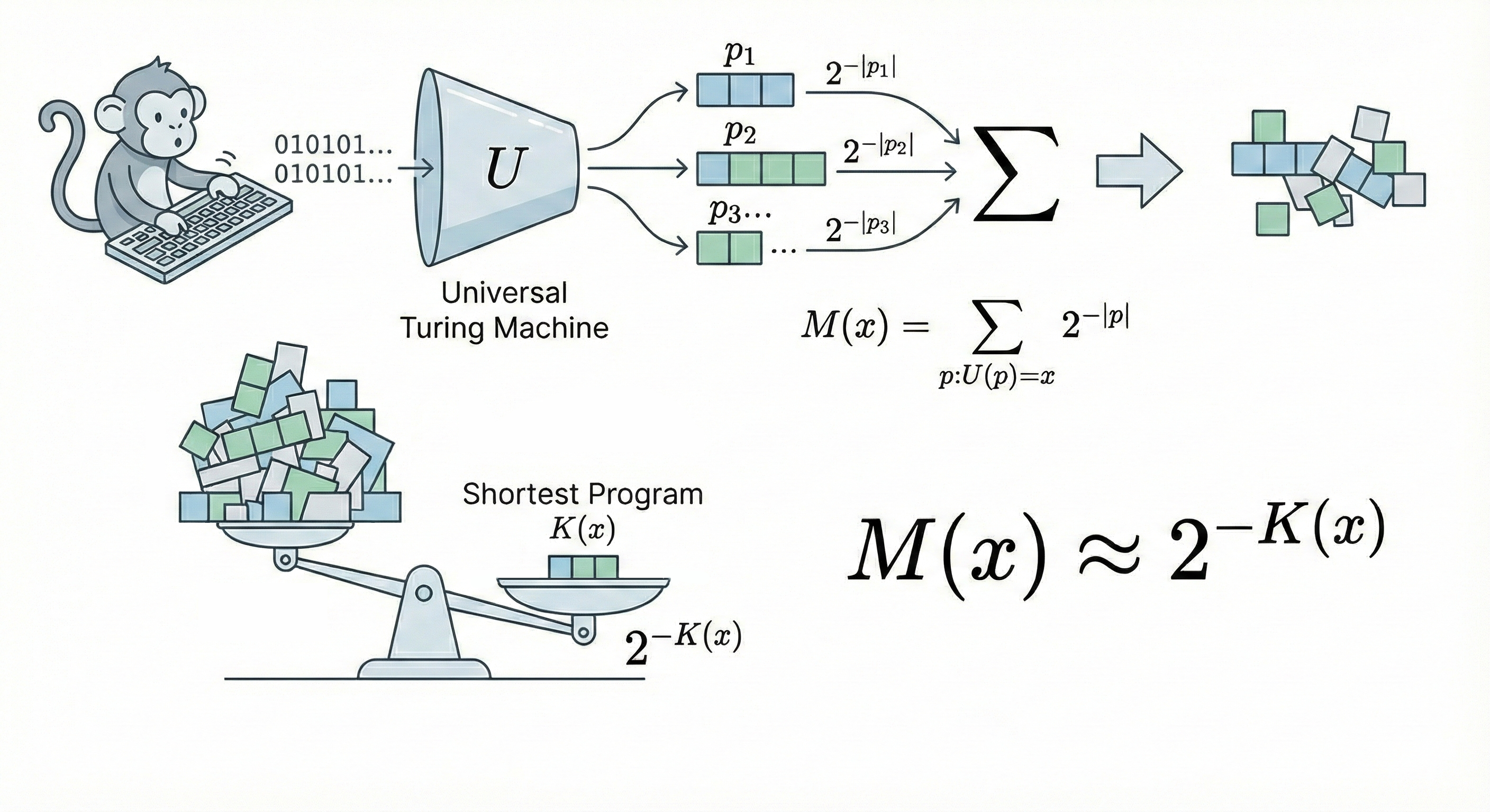 $$ M(x) = \sum_{p:U(p)=x} 2^{-|p|} $$Here appears a result that is not human-designed but a mathematical inevitability: because this is a summation of negative powers of 2, the total value will be dominated by the shortest program.
